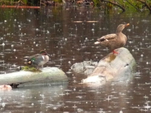 Male Green-winged Teal with Mallard female in the rain at the Rowing Club |