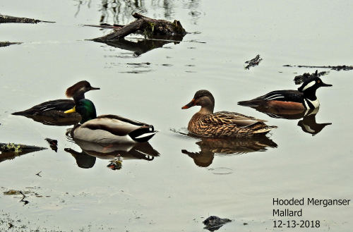 Mallard pair, with adult male (right) and juvenile male (left) Hooded Mergansers.