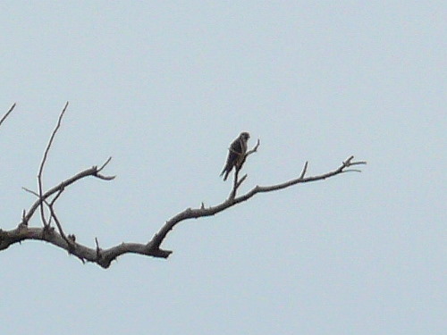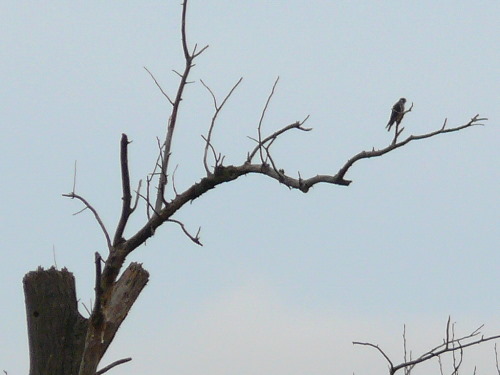 Soon after, a raptor was spotted in Snag Row. Distant looks were inconclusive, so we hurried closer. While we were on the chase, a NORTHERN SHRIKE landed in Snag Row a dozen trees west of the raptor. The raptor was finally positively identified as a juvenile PEREGRINE FALCON, and it then flew strongly to the south.