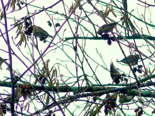- Pine Siskin - One or two fairly large flocks (~30), after a few weeks of tiny groups or singletons