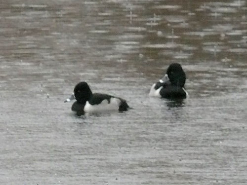 Two of three male Ring-necked Ducks in the rain at the Rowing Club |