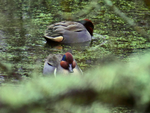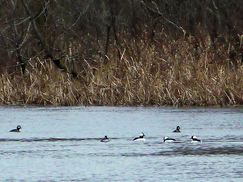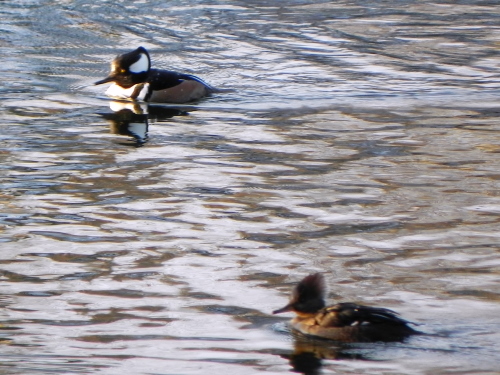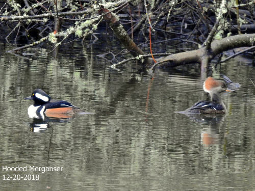 - Hooded Merganser - at least two below the weir, and a flock of 15 in the slough above the weir