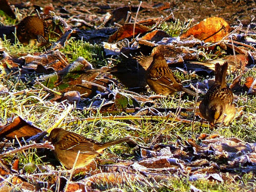 - White-throated Sparrow – One with large flock of Golden and White-crowned Sparrows, NW part of the Dog Area