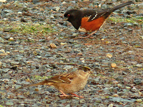 Male Spotted Towhee (top) and Golden-crowned Sparrow. Photo by Ollie. |