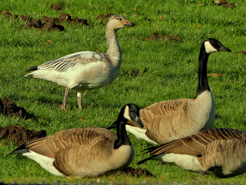 Juvenile Snow Goose with Canada Geese. Photo by Ollie Oliver