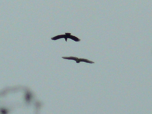 Just as I was heading south from the Dog Area, I heard a Common Raven calling from above. At first I thought the raven must be perched atop one of the tall cottonwoods, but finally I saw it flying very high above the trees. Actually, I thought there were two ravens, but when I got a look at them with my binocs, I could see that one of them wasn't a raven - It was a SNOWY OWL. The owl was slowly cruising southwest, quite high up. I don't know how long the raven had been flying with it, harassing it all the time, but it may well have been for miles. Ravens are much more common in the Snoqualmie Valley than the Sammamish Valley. Soon after passing over the river, the raven broke off its pursuit and headed back to the east.