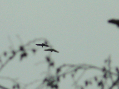 Common Raven harassing a SNOWY OWL as it flew west over the park.