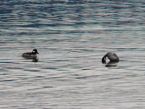 ![]() First-year male Bufflehead (right), who was performing a full range of displays trying to attract the attentions of females. Note the larger white cheek patch and whiter sides, compared with the female. 2007-04-19 |