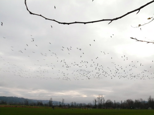 In recent winters, it has been commonplace to see flocks of hundreds of Cacklers fly over the park each morning, with some of the flocks landing in the park on mowed grass fields, and others continuing to fly, perhaps up to the Sammamish valley. By far, the majority of the birds seen are of the minima subspecies. While sub-specific identification of "white-cheeked" geese can be difficult, minimas are relatively easy to recognize, because of their extremely small stature. On occasion, however, we have seen Cacklers that are clearly a larger sub-species. This is an area for future study. |