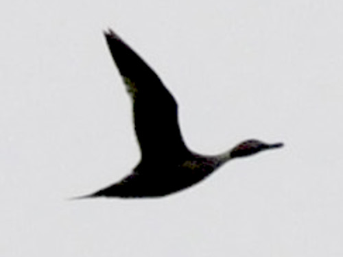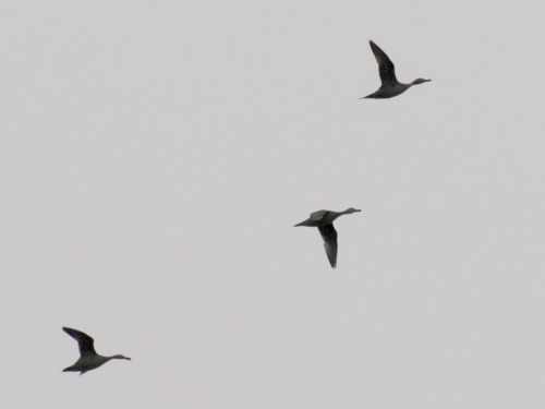 Virtually all of the Northern Pintail sightings we've had at the park have been of flocks flying overhead, primarily in December and January, but with a scattering of fall and spring sightings. Sometimes they fly with American Wigeon, and identification within distant flocks can be difficult, so that we often can only tell there were at least a few of each species, with the rest of the flock left undifferentiated. |