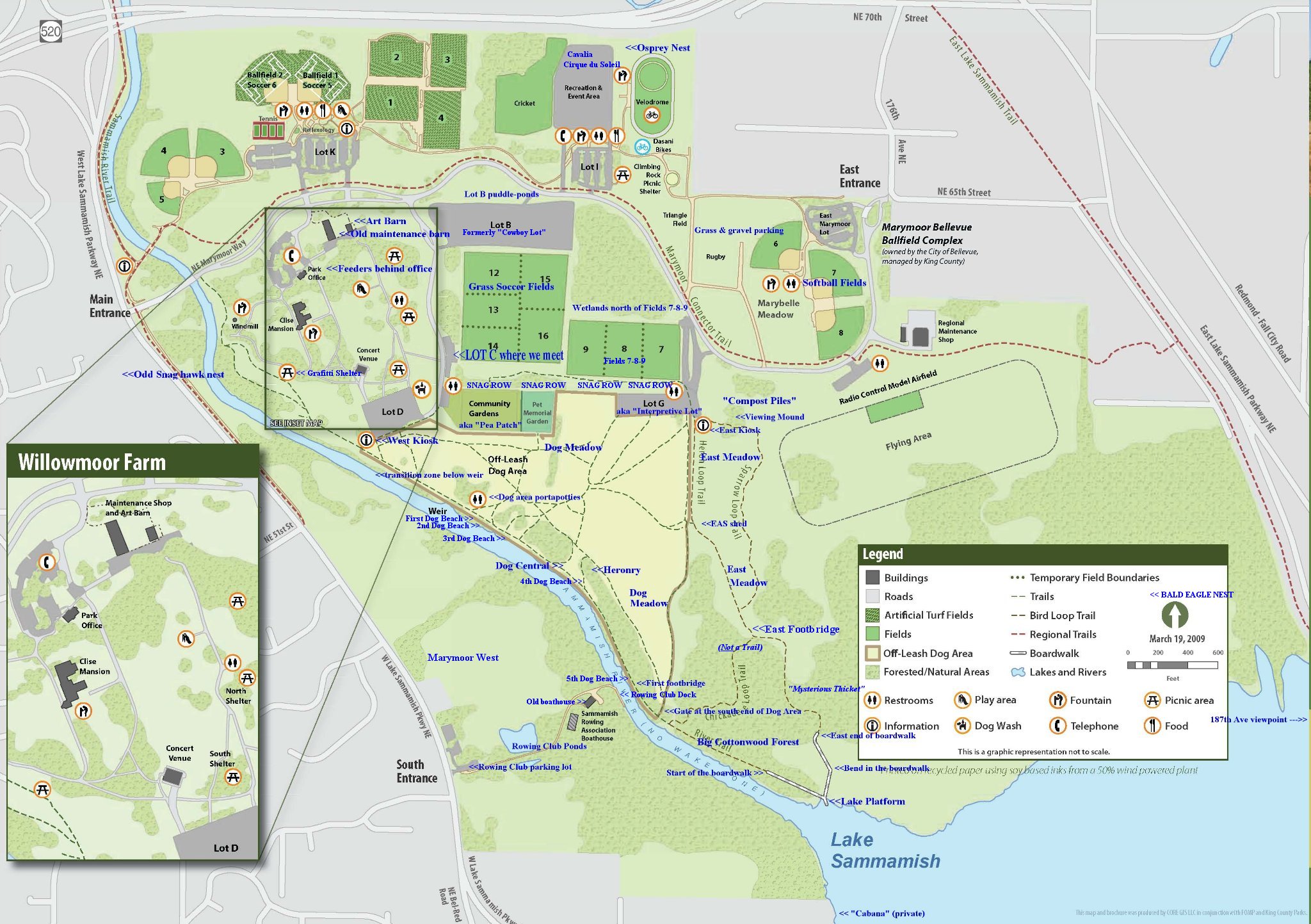 We walk from there to the slough trail, which runs south along the slough to Lake Sammamish, then curves back to the northeast to the Interpretive Lot (Lot G). We then cut back to the cars. Total distance is about 3 miles, but we often spend 4+ hours on the walk. We then walk around Clise Mansion, and then head over to the Rowing Club at Marymoor West. You can join us for an hour or two or for the whole morning.