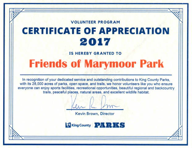 following Certificate of Appreciation to the Friends of Marymoor Park: |
